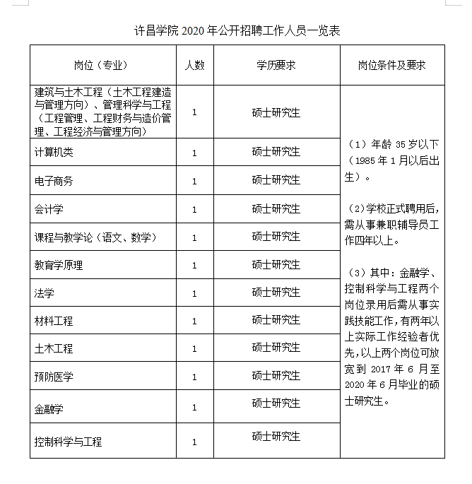 5.20186月至20206月毕业的硕士研究生。其中:金融学、控制科学与工程两个岗位录用后需从事实践技能工作,有两年以上实际工作经验者优先,以上两个岗位可放宽到20176月至20206月毕业的硕士研究生;