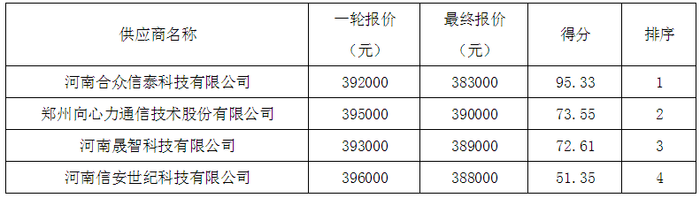 2、采购人确认成交供应商:河南合众信泰科技有限公司,成交金额:383000元,地址:河南自贸试验区郑州片区(郑东)商务内环路9号楼9层。