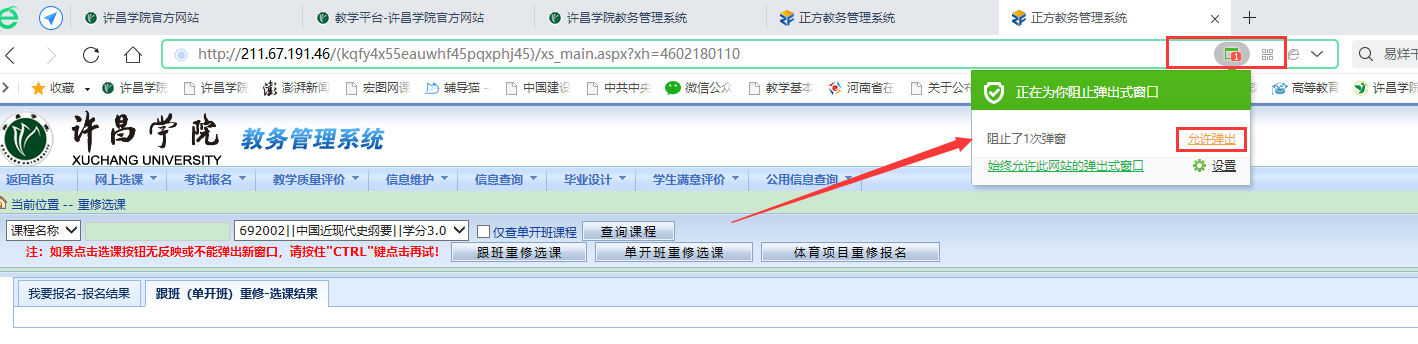 (1)当没有弹出任何新窗口时,请检查是否被浏览器拦截(下图红色箭头指示即为浏览器拦截,请点击拦截图示,选择允许弹出才能正常选课)。