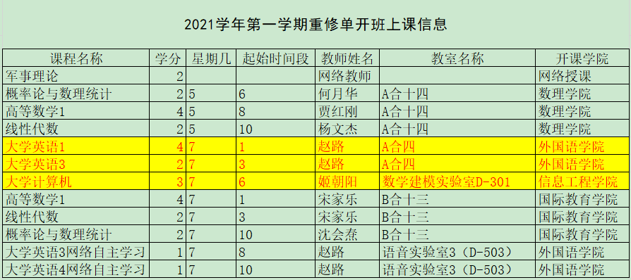 1.本学期单开班重修课程如下: