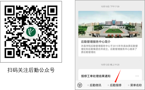 关注“bet36体育在线后勤管理服务中心”微信公众号,点击“后勤报修”发起报修申请。
