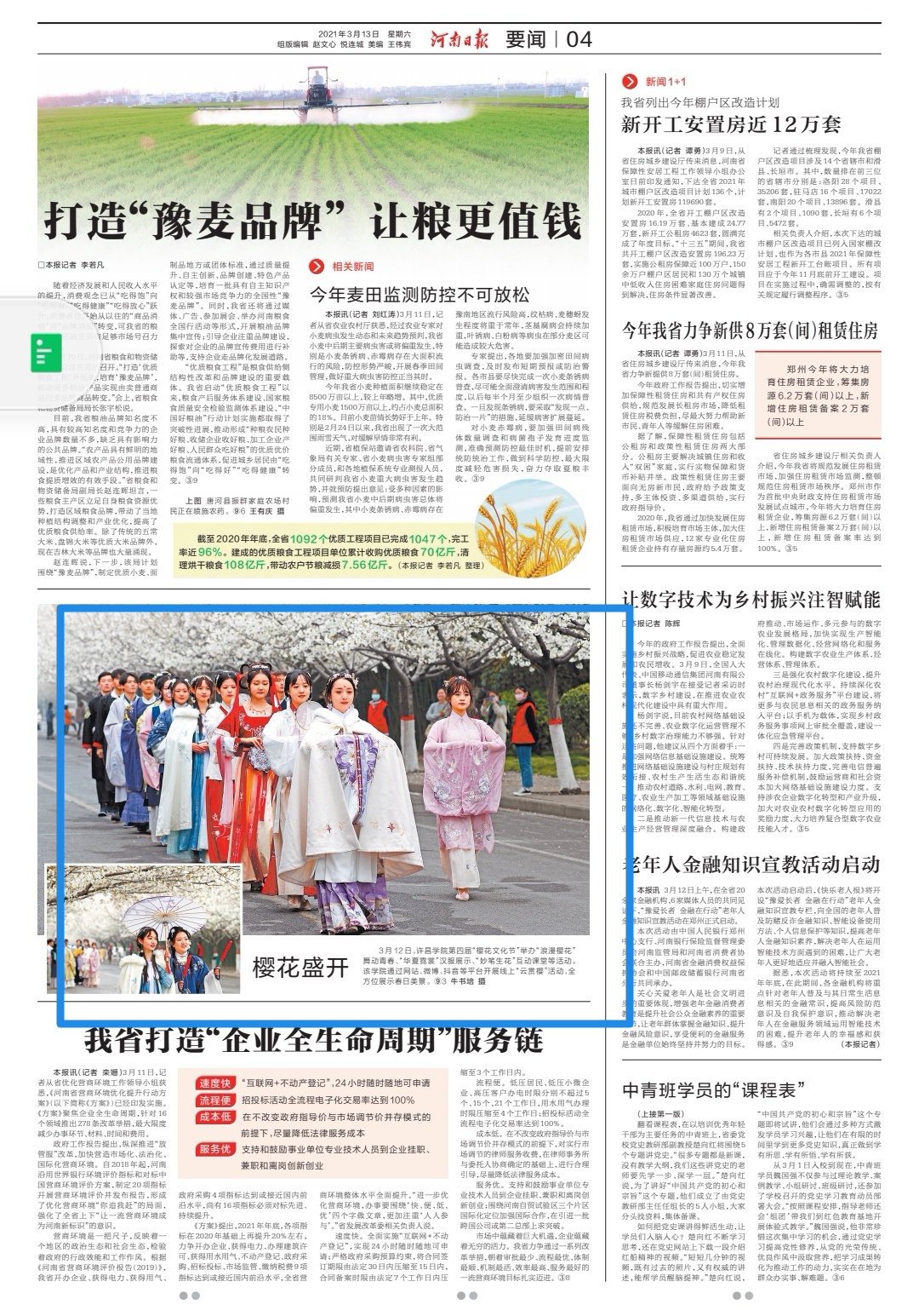 《河南日报》2021年3月13日第四版“要闻”发表新闻图片:樱花盛开! 3月12日,bet36体育在线第四届“樱花文化节”举办“浪漫樱花”舞动青春、“华夏霓裳”汉服展示、“妙笔生花”互动课堂等活动。该学院通过网站、微博、抖音等平台开展线上“云赏樱”活动,全方位展示春日美景。
