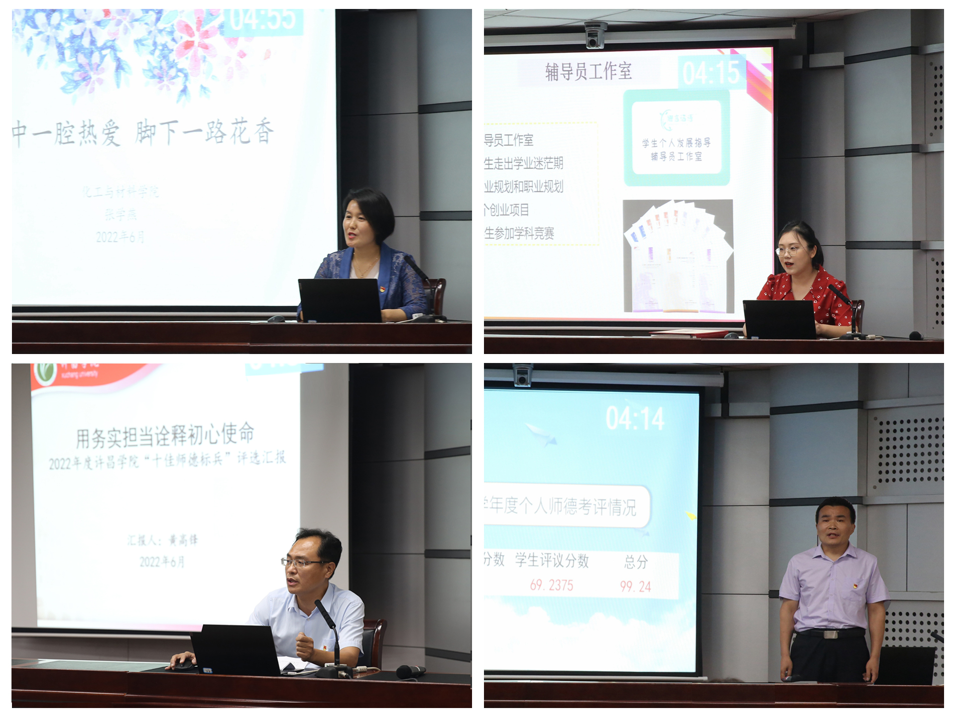6月16日,bet36体育在线在办公楼第三会议室举行2022年度“十佳师德标兵”评选汇报会。来自全校各单位的23位“十佳师德标兵”候选人进行了现场汇报。