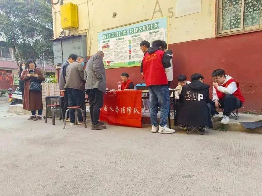 3月3日下午2点,队员们到达了学校定点创文帮扶社区——许昌市房管局家属区、德科苑小区,在小区门口放置好桌椅,不一会儿就围上来了很多居民。队员们各司其职,开始忙碌起来:组织小队负责给居民们登记,宣传小队在一旁向居民们科普用电常识,维修小队拿着各种维修工具精细地修理故障的家电。