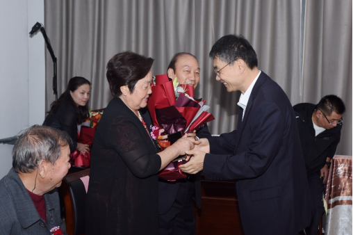 仪式上,离退休工作处党委书记唐红亮宣读了金婚钻石婚伉俪名单。学校领导向金婚钻石婚伉俪敬献鲜花并合影留念。