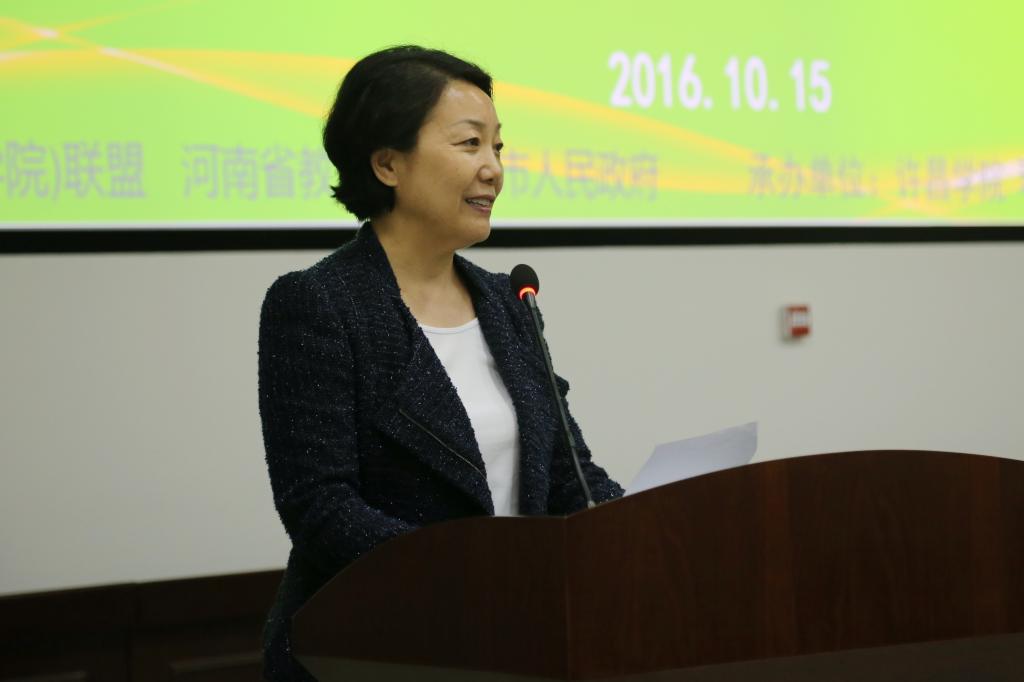 教育部学校规划建设发展中心规划与研究处刘志敏处长在大会上讲话。他说,教育部在2014年发出了产教融合宣言,两年来转型发展在波澜壮阔的推进中。河南、许昌始终是走在前列,这次专业协作会的成立又是标志性的成果。近年来bet36体育在线在绿色科技、绿色创新、绿色活动上做出了系统性设计。所有联盟成员也要发挥这样的示范引领作用,都应该成为区域绿色技术转移的中心,成为绿色教育绿色文明的辐射源。联盟要贯彻“共享”、“开放”理念,向企业开放、向政府开放,在开放中互通有无,共同成长,要多层面广泛交流,真正成为一家人、真正成为创新共同体;高校要构筑创新生态,要做基因的输出者,输出理念、输出设计、输出这些创新的“基因”,引导整个社会整个教育形成一个生机勃勃的创新体系;学校也要主动和政府、企业合作,构筑一个创新的生态,同时注重国际合作,成为价值的创造者、贡献者和奉献者。