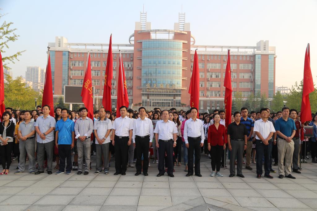 党委副书记马超指出,我们在抗战胜利70周年之际举行新学期升旗仪式,就是要引导广大师生铭记历史、缅怀先烈、珍爱和平、开创未来,将伟大的抗战精神转化为实现中华民族伟大复兴的强大精神动力,坚定理想信念,铸造坚强意志和品格,为实现中华民族的伟大复兴不懈奋斗。(摄影:宁智沛)