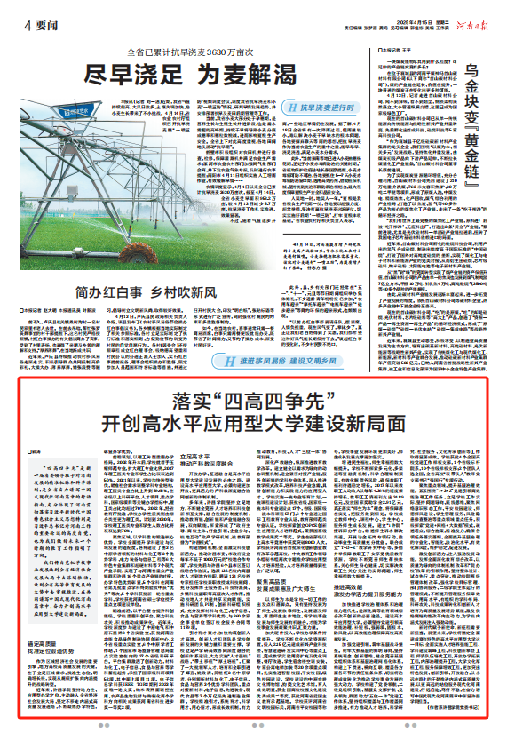 2025年4月15日,《河南日报》第4版刊发bet36体育在线党委书记郭涛教授署名文章——《落实“四高四争先”,开创高水平应用型大学建设新局面》。