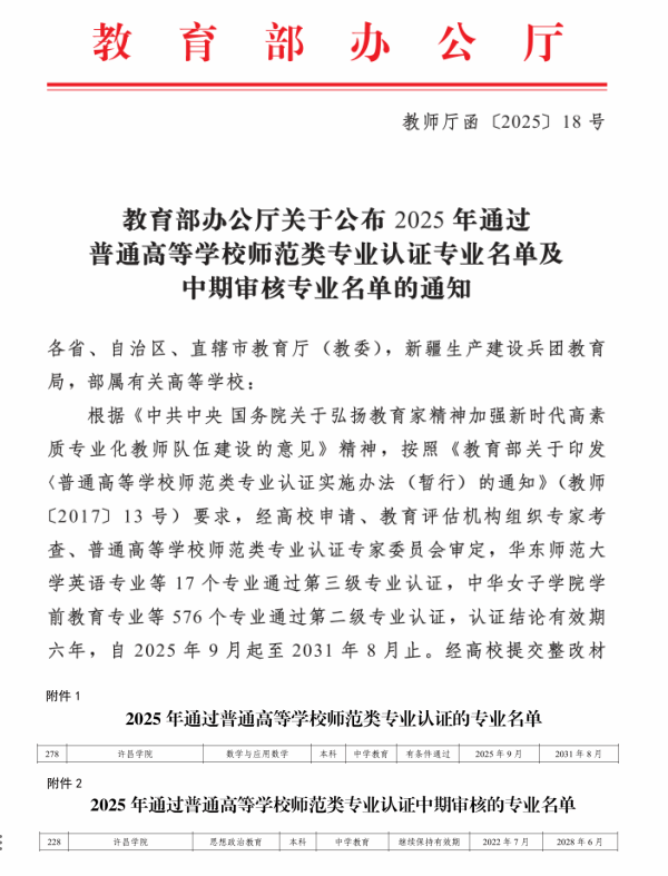 近日,教育部办公厅下发了《关于公布2025年通过普通高等学校师范类专业认证专业名单及通过中期审核专业名单的通知》(教师厅函〔2025〕18号),bet36体育在线数学与应用数学专业通过师范类第二级专业认证,认证结论有效期为六年;思想政治教育专业通过师范类专业认证中期审核,继续保持原认证有效期。