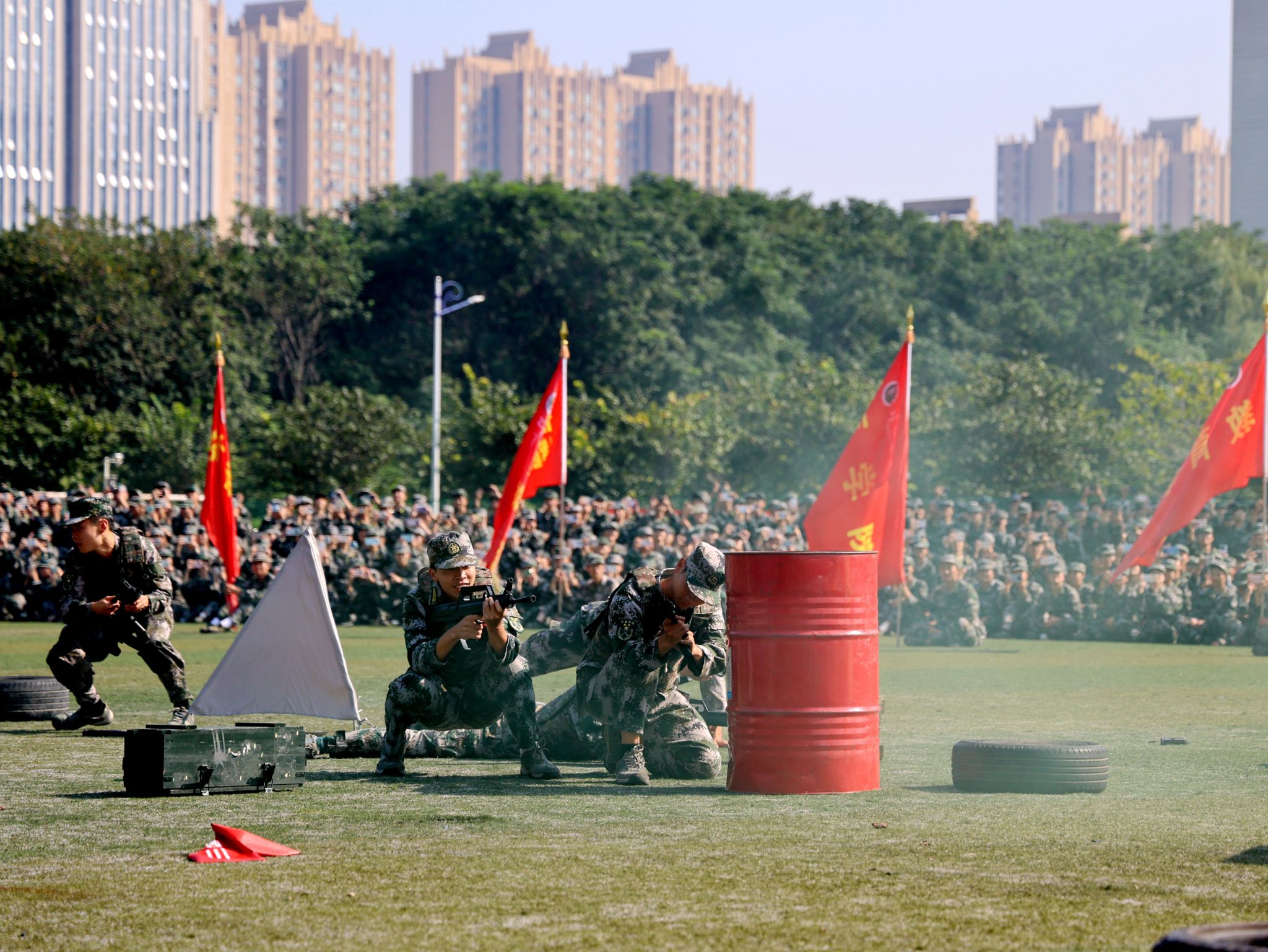入场分列式表演上,2025级新生组成34个连队,精神抖擞地迈着正步,高喊口号,依次走过主席台接受检阅。特色科目方队进行了精彩的刺杀操、匕首操、擒敌拳、旗语操、应急棍术操以及战术综合演练等军事技能汇演,充分展现了新生们的训练成果与昂扬斗志。