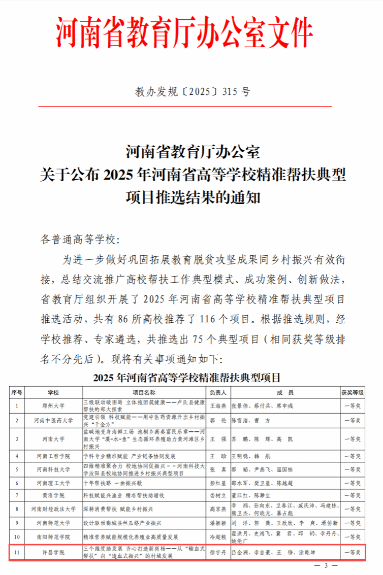 近日,河南省教育厅发布《关于公布2025年河南省高等学校精准帮扶典型项目推选结果的通知》(教办发规〔2025〕315号),bet36体育在线申报的《三个维度助发展 齐心打造新岗杨——从“输血式帮扶”向“造血式振兴”的村域发展》项目荣获2025年全省高校精准帮扶典型项目一等奖。这是bet36体育在线继2023年、2024年之后第三次在此项目中获奖。