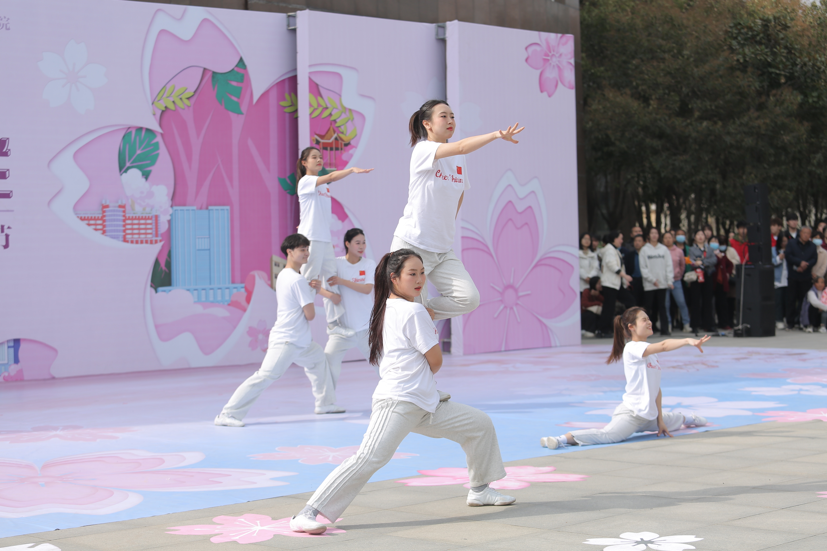 开幕式结束后,校领导和广大师生们一同观赏了丰富多彩的文化活动。校园樱花盛开的闻理路上,大学生们的汉服走秀、古风歌舞、茶艺表演、戏曲体验等活动,展示了中华优秀传统文化的风采和魅力;舞狮、徒手操、歌曲串烧、合唱等表演,展现了当代青年朝气蓬勃、青春洋溢的精神面貌。各学院学生结合专业特点,制作樱花树脂、樱花书签、樱花美食等周边产品,彩绘樱花妆容、勾勒植物地图,在提升活动参与度的同时,充分展现了大学生的专业基础、实践能力和综合素质。