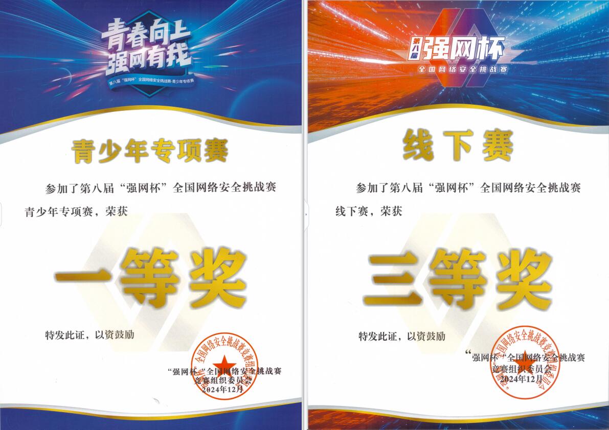 “强网杯”全国网络安全挑战赛由中央网信办、河南省人民政府指导,信息工程大学、河南省委网信办、河南省教育厅、郑州市人民政府、中国网络空间安全协会主办,教育部高等学校网络空间安全专业教学指导委员会协办。该赛事知识覆盖面广、技术挑战度高,且不区分科研机构、行业企业、高校、社会团体,是公认的信息安全领域顶尖赛事。本次比赛中,由信息工程学院平源、马慧指导的“琢光信息安全实验室”派出22级信息安全专业学生杨科研、赵江亭、张席宁等跨校、企组建的联合战队(天命-XCU-HTK),线上赛中进入全国前32强,此次线下比赛最终获得三等奖(全国第22名),合计获赛事奖励两万元。由23级信息安全专业学生陈博牵头组建的联合战队(VaN)在强网杯青少年专项赛中,斩获一等奖(全国第1名),荣获赛事奖励六千元。
