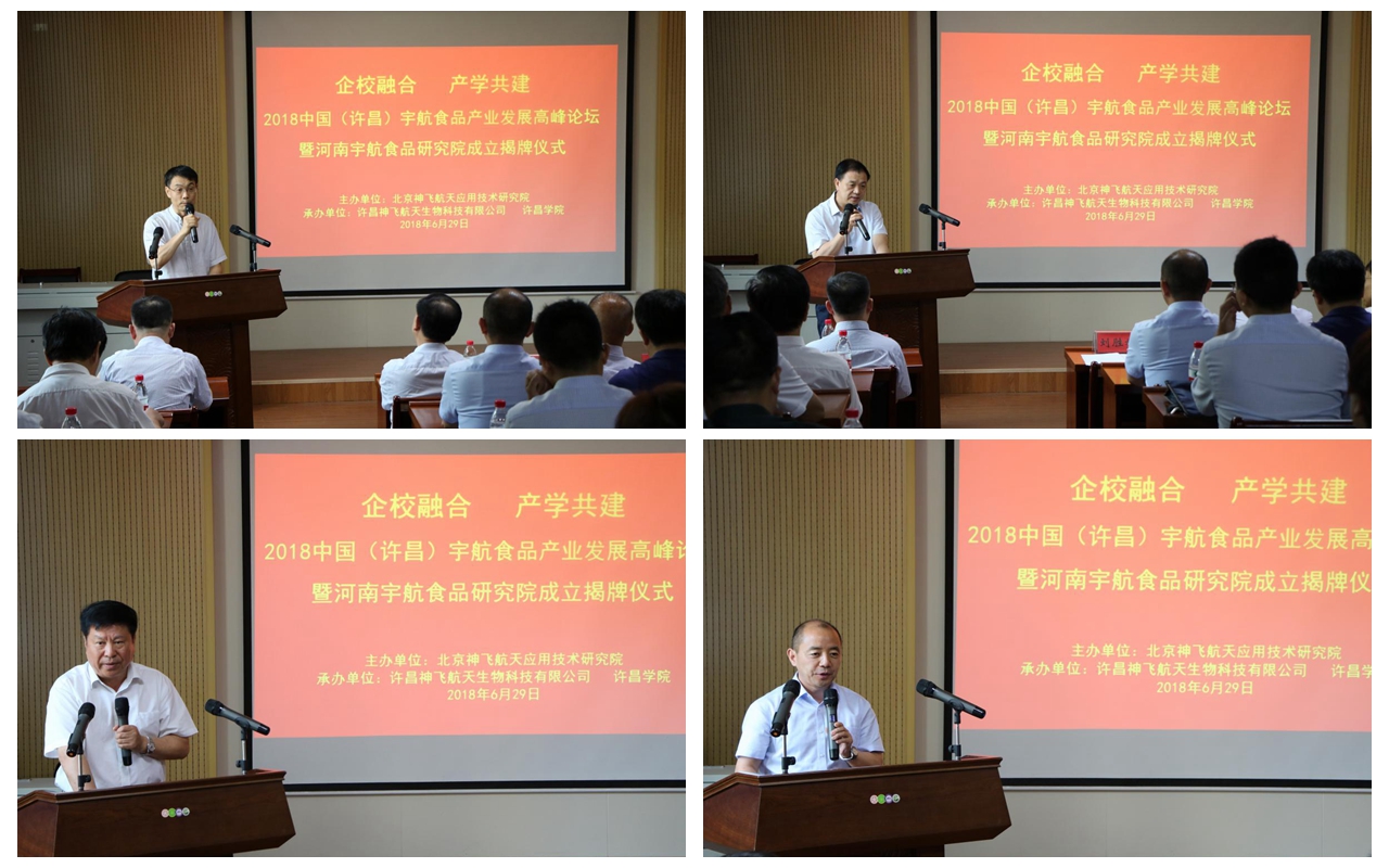 许昌市政府副市长刘胜利代表许昌市政府发表讲话。他指出,许昌作为郑州大都市区次中心城市,历史文化悠久,交通区位优越,生态环境优良,培育形成了包含生物医药在内的七大特色优势产业、四大战略性新兴产业。此次北京神飞航天应用技术研究院与bet36体育在线合作,成立河南宇航食品研究院,并在鄢陵建设中国宇航食品生产基地,是落实十九大精神的具体实践,双方通过校企合作、优势互补,以产业化的模式快速推进航天科技成果民用化,从源头到终端打造高效、安全绿色食品产业链,让更安全、更有营养的航天食品走进寻常百姓家。