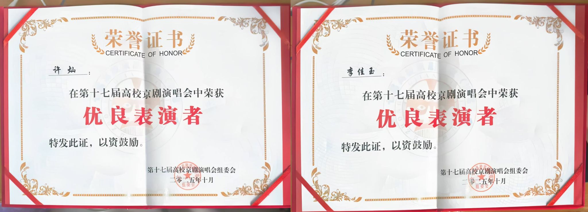 近日,第十七届全国高校京剧演唱会在江苏泰州落下帷幕,文史与传媒学院学生表现优异、斩获佳绩,许灿、李佳玉两名参赛同学均荣获“优良表演者”称号。