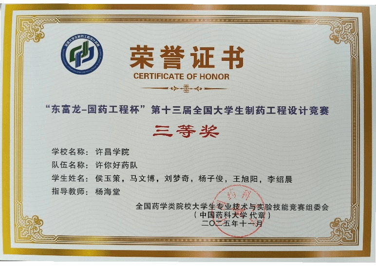 近日,第十三届全国大学生制药工程设计竞赛全国总决赛在上海松江圆满落幕。bet36体育在线食品与药学院学生侯玉策、马文博、刘梦奇、杨子俊、王旭阳、李绍晨组成的“许你好药队”在教师杨海堂的指导下,成功斩获决赛三等奖。