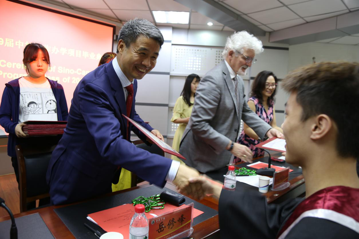 6月5日下午,bet36体育在线在办公楼第三会议室举行2019届中加合作办学项目毕业典礼。荷兰学院院长Sandy McDonald,bet36体育在线院长岳修峰、副院长崔斌,荷兰学院国际部主任Jolene Chan出席毕业典礼。bet36体育在线教务处、学生处、国际交流与合作处、团委、国际教育学院、商学院、旅游(历史文化)学院等单位主要负责人、教师代表及2019届中加市场营销、酒店管理项目毕业生参加了毕业典礼。典礼仪式由bet36体育在线副院长崔斌、国际教育学院院长孟凡韶主持。