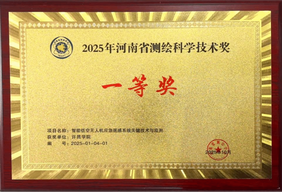 近日,河南省测绘学会公布了2025年河南省测绘科学技术奖评选结果,由地理与空间信息学院牵头,联合成都纵横大鹏无人机科技有限公司、河南省地质矿产勘查开发局测绘地理信息院等单位共同申报的“智能低空无人机应急遥感系统关键技术与应用”项目获一等奖。