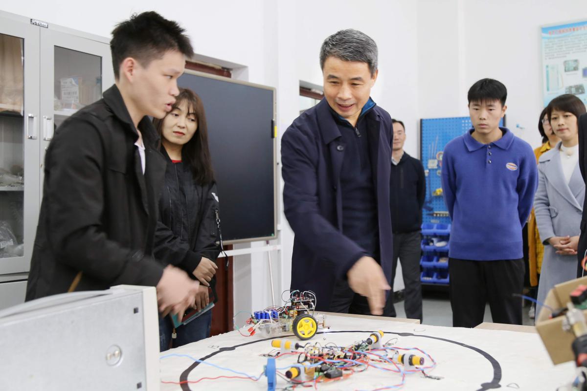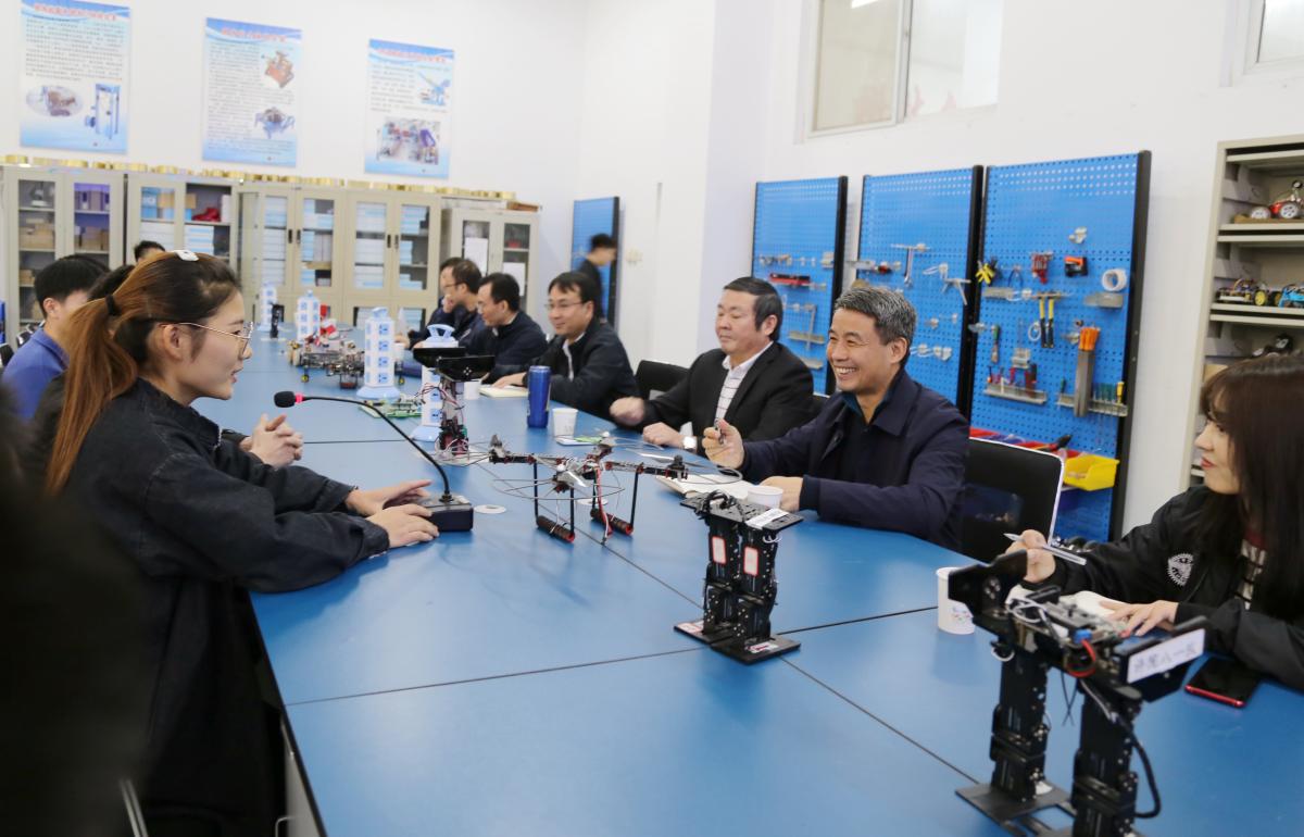 院长岳修峰参观了电气(机电)工程学院科技创新中心的我爱发明、科技竞赛、创客空间等工作室,与正在进行机器人调试测试的同学亲切交谈,询问了解他们的工作进展情况和调试工作中的技术难点。