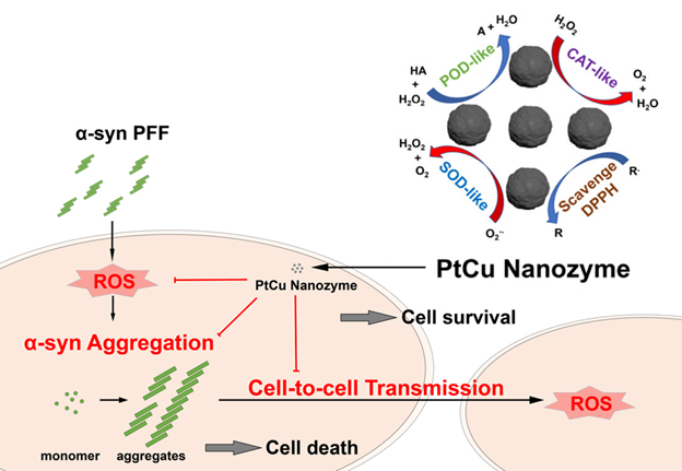 图:PtCu纳米酶清除活性氧物种和阻止病理α-突触核蛋白细胞间传播机理图