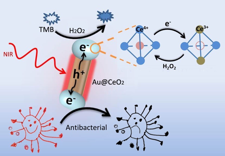 图:等离激元效应增强Au@CeO2杂化纳米结构材料类酶和抗菌活性机理图