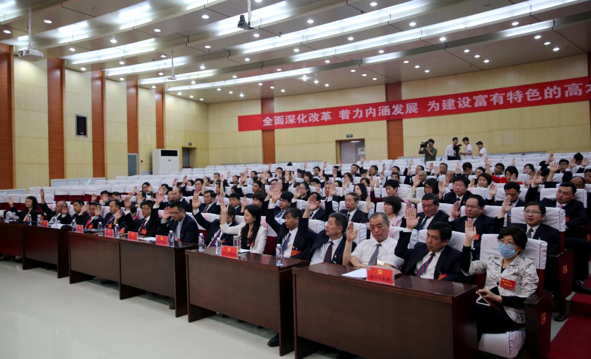 全体与会代表举手表决通过关于两委工作报告的决议