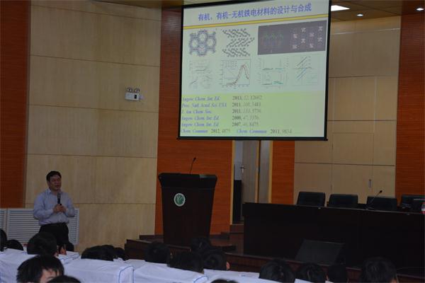 报告会上,苏成勇教授介绍了配位超分子化学这一研究热点及其课题组近年来在纳米分子容器与反应器的合成和性质研究方面的优秀成果。苏教授从配位超分子化学的基础知识、配位超分子的自组装原理以及配位超分子在催化、纳米反应容器、光电、手性拆分等性质方面对配位超分子化学进行了较详细的讲述。龙腊生教授介绍了铁电材料的一些基本性质和特点,对铁电材料在电、磁、力、热及光等领域的应用前景进行了讲述。龙教授还介绍了其课题组近年来在合成有机铁电体、