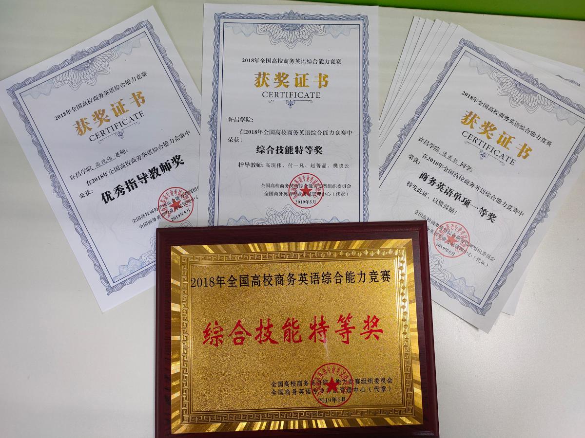 学院积极组织选拔学生参加各类学科专业竞赛,以赛促学,在比赛中磨砺、成长、提升。近三年来,外语学子在河南省师范毕业生教学技能大赛、全国外贸从业能力大赛、全国口译大赛、首届“讲好河南故事”英语竞赛、21世纪杯全国英语演讲比赛等赛事中共获省级及以上奖励173项。2019年6月,在历时11个月的“全国高校商务英语综合能力竞赛”中,面对来自对外经济贸易大学、四川外国语大学、广东外语外贸大学和中南民族大学等全国64所院校的3078名选手,商务英语专业学生敢于竞争,勇于拼搏,最终以优异的成绩荣获团体“综合技能特等奖”,潘美钰、彭桂梅、赵迪、张倩倩四位同学获“商务英语单项一等奖”。
