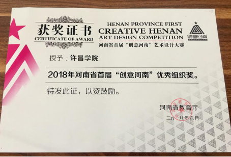 近日,由河南省教育厅主办,河南省学校艺术教育协会、黄河科技学院承办的首届“创意河南”艺术设计大赛作品展评征集评选结果公布。bet36体育在线设计艺术学院组织学生参加此次大赛并获得金奖5项、银奖3项、铜奖8项、优秀奖16项、教学成果奖4项、优秀指导教师奖3人,bet36体育在线荣获优秀组织奖。