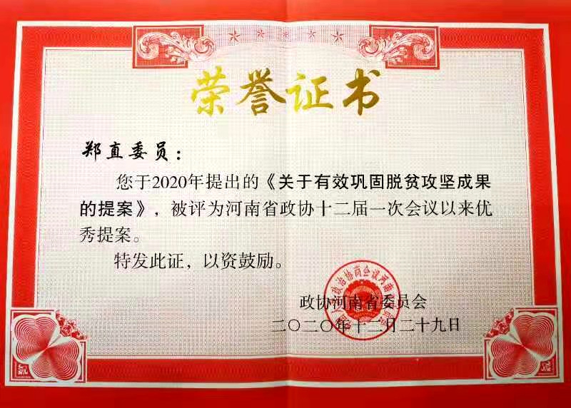 1月17日,政协河南省委员会对十二届一次会议以来的优秀提案和先进承办单位进行表彰,bet36体育在线郑直副院长的提案《关于有效巩固脱贫攻坚成果的提案》作为优秀提案受到表彰。