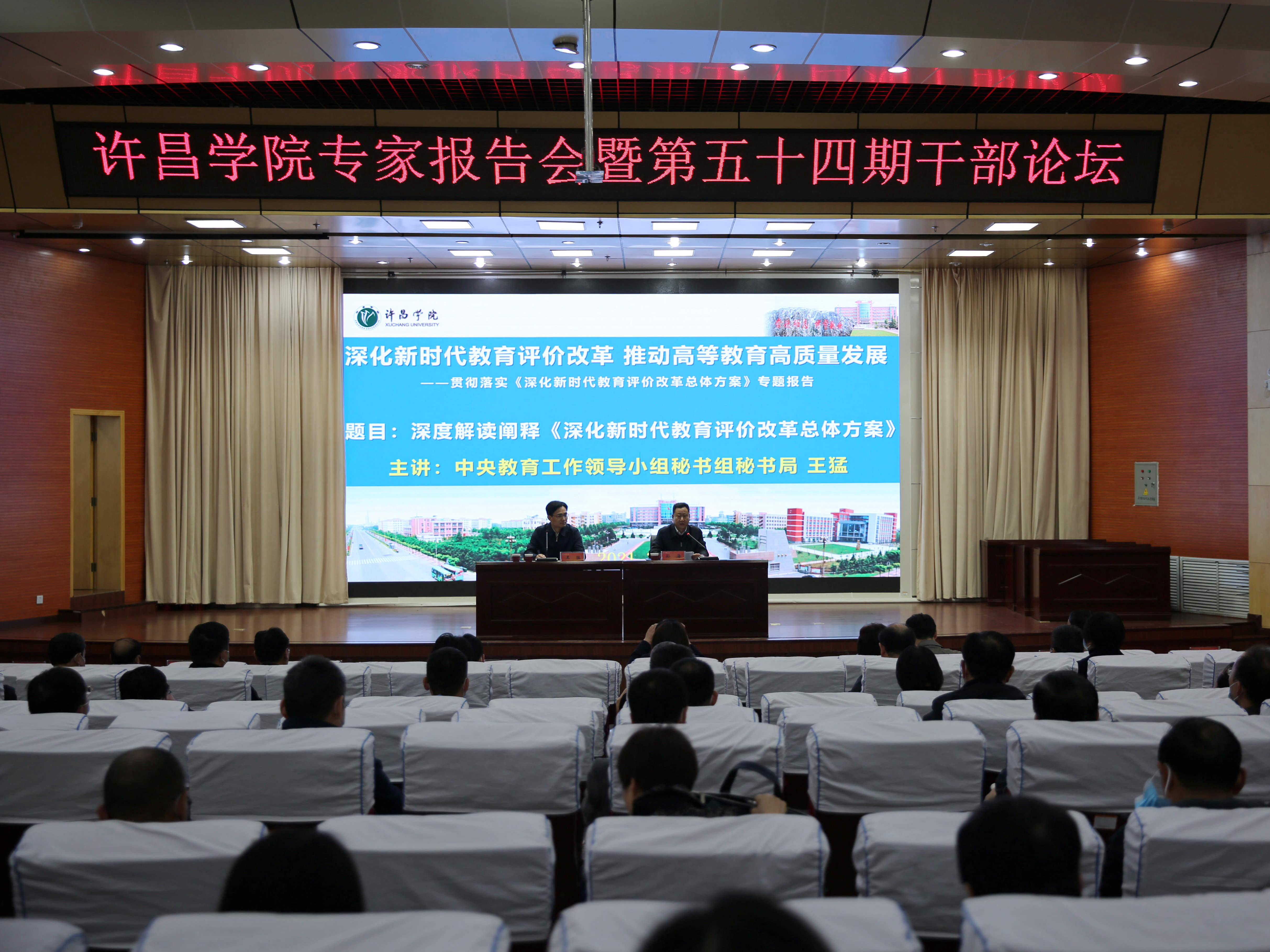 3月27日上午,bet36体育在线在图书馆二楼学术报告厅举办《深化新时代教育评价改革总体方案》(以下简称《总体方案》)专家报告会暨第五十四期干部论坛。报告会特邀中央教育工作领导小组秘书组秘书局副局长王猛主讲。校党委副书记孙海,副院长郑直、崔斌、潘春彩出席报告会,全体中层干部参加会议并听取报告。会议由党委副书记孙海主持。