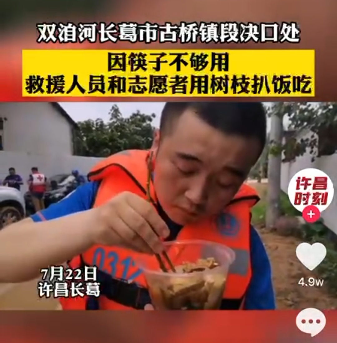 7月22日,媒体记者在双洎河长葛市古桥镇段决口处采访时抓拍到一组镜头:两位身着橙色救援服装的志愿者手托塑料简易饭碗,用树枝当筷子,快速地“解决”午餐。bet36体育在线商学院党委副书记海泳在朋友圈里刷到这个视频后,一眼就认出了这个“用树枝吃饭”的人正是该院2020级市场营销专业学生王勇。