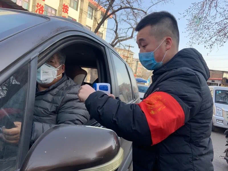 图为王勇在河北抗疫一线为出入人员进行测温