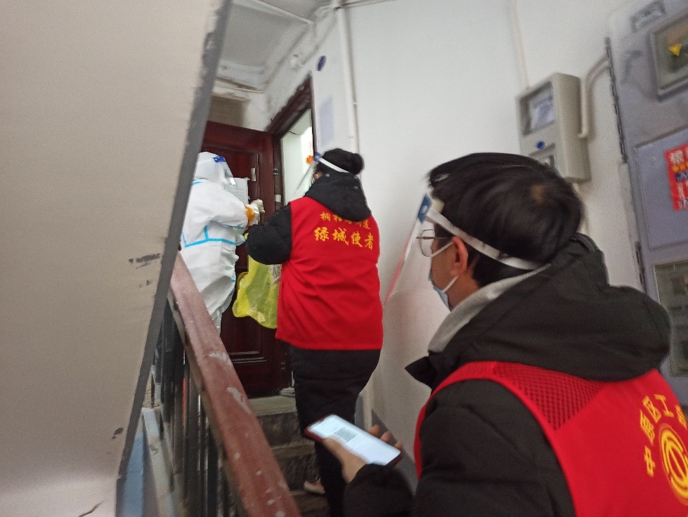 陈公(左一)为核酸检测人员测温
