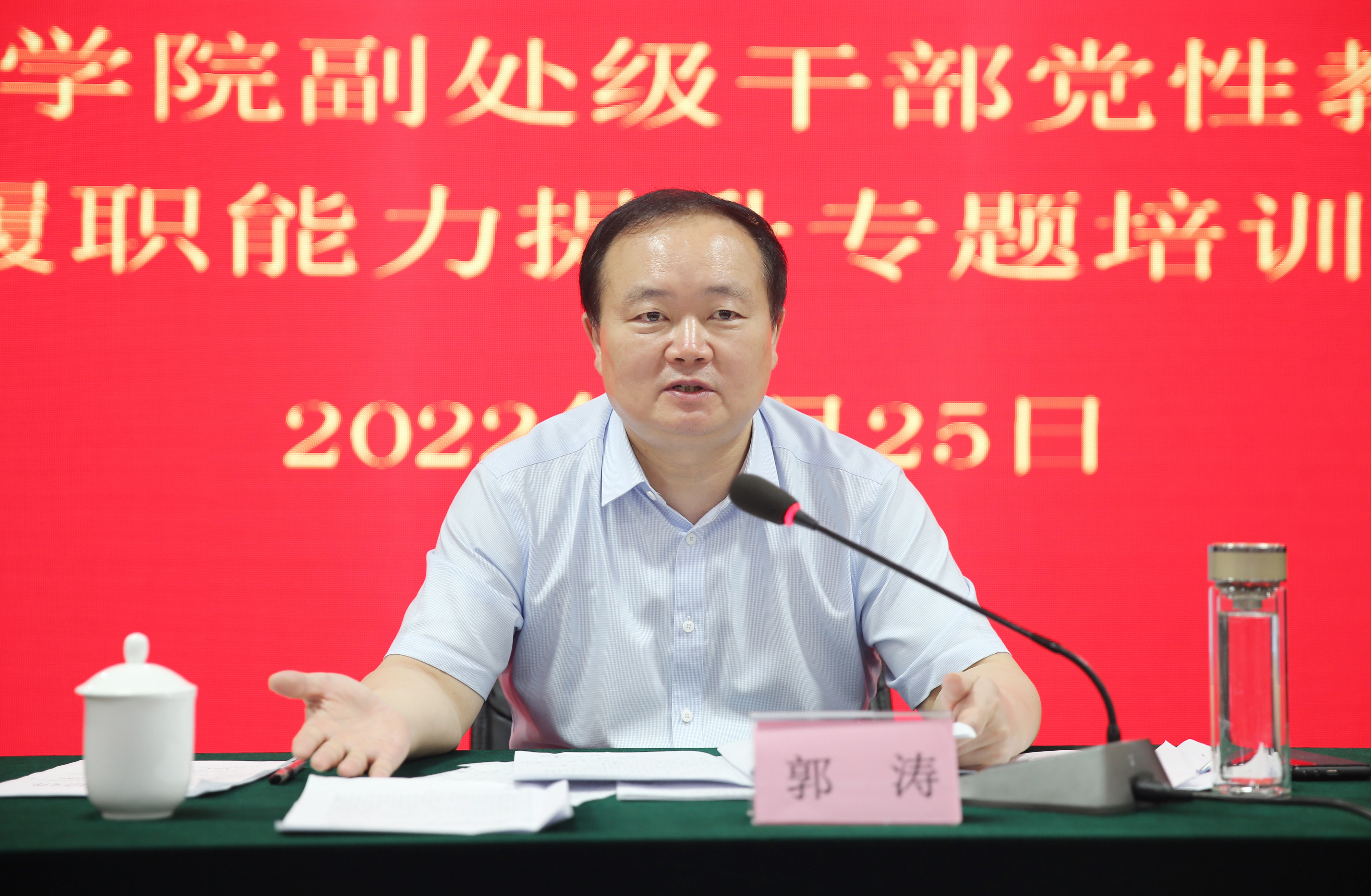 培训期间,党委书记郭涛作《认清形势 统一思想 提升能力 改进作风——奋力开创学校事业发展新局面》专题报告。郭涛在报告中深入分析了当前学校高水平应用型大学建设所处的关键阶段和面对的形势机遇,围绕聚焦“办学特色凝练”“办学层次提升”“办学空间拓展”三大攻坚任务,推动学校内涵式、高质量发展,中层副职干部履职应具备的基本要求和提升能力、转变作风,提振干事创业精气神等方面明确了目标任务,厘清了工作思路。