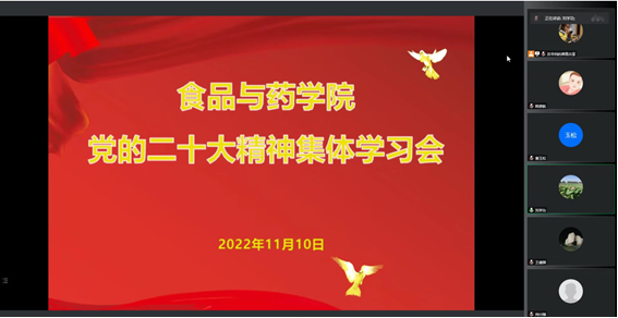11月10日下午,食品与药学院党委以线上形式召开党的二十大精神集体学习会。会上,食品与药学院党委书记刘学功领学了中国共产党第二十次全国代表大会报告和学校学习贯彻党的二十大精神集体学习会议精神。会议指出,习近平总书记所作的二十大报告,通篇贯穿习近平新时代中国特色社会主义思想,描绘了全面建设社会主义现代化国家、实现第二个百年奋斗目标的宏伟蓝图,是我们党开启新时代新征程的政治宣言和行动纲领。会议要求,全院党员教师要笃行不怠强化理论武装,要紧密联系工作实际,达到融会贯通,切实把理论学习成果转化为推动学院各项事业发展的不竭动力,真正做到用党的二十大精神武装头脑、指导实践、推动工作;要做好学习成果转化,坚持围绕立德树人根本任务,持续加强推进课程思政建设,切实把党的二十大精神贯彻到学院工作全过程、体现在学院发展各方面,为学校事业高质量发展贡献力量。(图片由各基层党委、直属党支部提供)