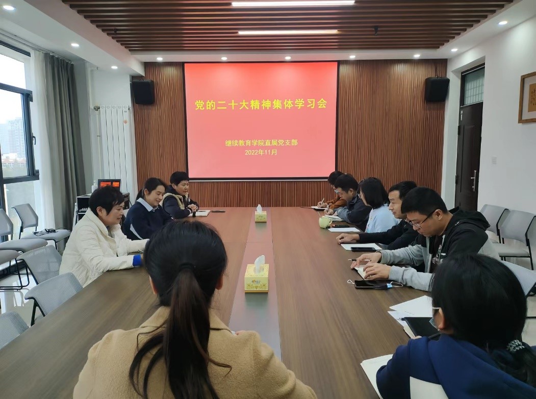 11月2日和7日,继续教育学院直属党支部先后两次以线上线下相结合的方式召开党的二十大精神集体学习会。继续教育学院直属党支部书记张雪洁领学了党的二十大报告,传达了学校学习贯彻党的二十大精神集体学习会议精神,对深入学习宣传贯彻党的二十大精神进行安排部署。会议强调,认真学习贯彻党的二十大精神是当前和今后一个时期的首要政治任务。要深刻领会党的二十大精神内涵,把学习贯彻党的二十大精神作为全体教职工的“必修课”“首选课”,确保入脑入心、学深学透。党员领导干部要切实发挥表率作用,带头学习、带头贯彻,把党的二十大精神转化为谋划发展的思路、促进发展的措施、领导发展的能力、推进发展的力量。要学以致用,狠抓落实,结合学院实际,把党的二十大精神落实到学院改革发展的各方面、全过程,以实际行动奋力开创继续教育内涵式高质量发展新局面。