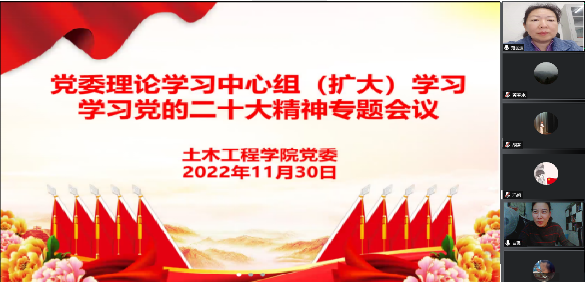 11月30日,土木工程学院党委以线上形式召开党委理论学习中心组(扩大)学习会议,专题学习党的二十大精神。会上,土木工程学院党委书记范丽波结合学院工作实际对深入学习贯彻党的二十大精神进行安排部署。会议要求,要把学习宣传贯彻党的二十大精神作为当前和今后一个时期的首要政治任务,持续学、深入悟,深刻领会精神实质,准确把握核心要义,让党的二十大精神成为推动学院各项事业发展的强大思想武器;要全面贯彻党的教育方针,落实立德树人根本任务,将党的二十大精神融入教育教学各环节和工作学习各方面,切实把学习成果转化为“为党育人、为国育才”的强大动力;要主动担当作为,围绕学院重点工作做好“转化”文章,进一步凝练专业特色、深化校地合作和产教融合,切实做好毕业生高质量就业工作,不断提升学院人才培养质量。