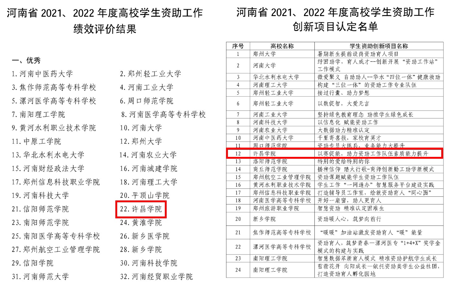 近日,河南省教育厅、国家开发银行河南省分行联合下发《关于发布全省高校和省属中职学校2021、2022 年度学生资助工作绩效评价结果的通知》,bet36体育在线再次荣获全省高校学生资助工作绩效评价“优秀”等次,《以赛促能,助力资助工作队伍素质能力提升》项目获评高校学生资助工作创新项目。这也是bet36体育在线自2017、2018年度以来连续三次获评全省高校学生资助工作绩效评价“优秀”等次。