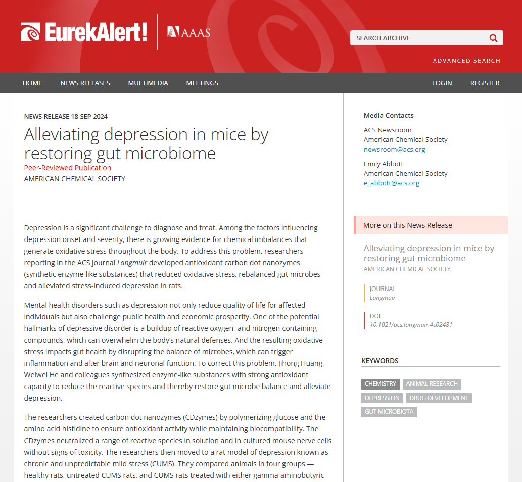 9月18日由美国科学促进会(AAAS)主办的全球科技新闻服务网站EurekAlert!以“Alleviating depression in mice by restoring gut microbiome”为题,报道了bet36体育在线化工与材料学院(表面微纳米材料研究所)在纳米酶治疗抑郁症方面的研究成果,该成果以“Antioxidant Carbon Dots Nanozymes Alleviate Stress-induced Depression by Modulating Gut Microbiota”为题发表在美国化学会旗下期刊Langmuir (DOI:10.1021/acs.langmuir.4c02481)。随后,美国化学会,美国物理学家组织网Phys.org, AZoNano, Applied Microbiology International等多家科技新闻网站纷纷报道,该研究得到了广泛国际关注。