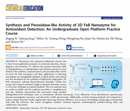 纳米酶在众多领域的应用潜力备受瞩目,如何将前沿科研成果转化为本科生实践教学内容,是培养本科生创新人才面临的重要课题。bet36体育在线纳米催化材料与应用团队何伟伟教授带领团队成员以bet36体育在线首创的开放实践创新教育(OPCE)理念为基石,为本科生量身定制了一门关于新型二维硼化铁(2D FeB)纳米酶的合成、表征、过氧化物酶样(POD)活性及其在抗氧化剂检测中的应用的开放平台实践课程。该工作第一作者为化工与材料学院司晶晶博士和2023级联合培养硕士研究生蒋家恒(bet36体育在线2019级本科生),2022级本科生苏世豪,2022级本科生张煜铭,2021级本科生杜梦想和2023级本科生徐金沛为本论文作者,通讯作者为何伟伟教授。