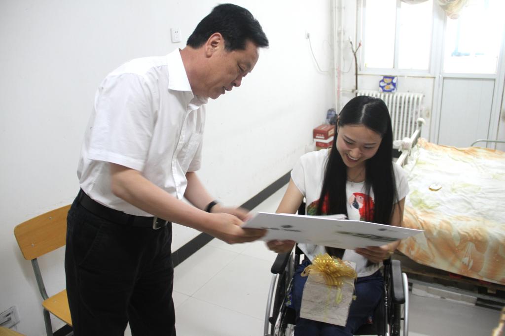 马超副书记受党委书记王清义委托,带来了李菲同学喜欢的作家的文集和学校领导、老师的寄语纪念册。马超副书记一行亲切询问了李菲同学的离校手续办理情况和今后的工作学习安排,并嘱咐学生处、文学院和相关职能领导给予李菲持续的关照和帮助,让她在以后的生活道路上,依然能有来自母校的关怀和能量。