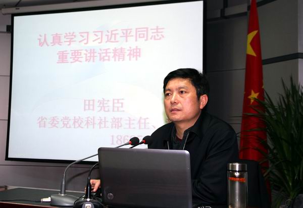 报告会上,田宪臣教授首先介绍了习近平总书记讲话的风格特点,概括介绍了习近平总书记讲话的主要内容,同时重点介绍了习近平总书记讲话中关于坚持和发展中国特色社会主义的论述,关于实现中华民族伟大复兴的中国梦的论述,关于全面深化改革开放、推动科学发展的论述,关于加强文化建设的论述等内容。田宪臣教授说,习近平总书记一系列重要讲话的主要内容,可以概括为:坚持一条主线,抓住两个关键,实现三个目标,防范四种危险,搞好五大建设,做到六个坚持。同时他指出,习近平总书记的系列重要讲话是对党的十八大精神的拓展和深化,为坚持和发展中国特色社会主义注入了新的丰富内涵。我们要深入学习总书记系列讲话精神,统一思想,指导实践,改进工作。