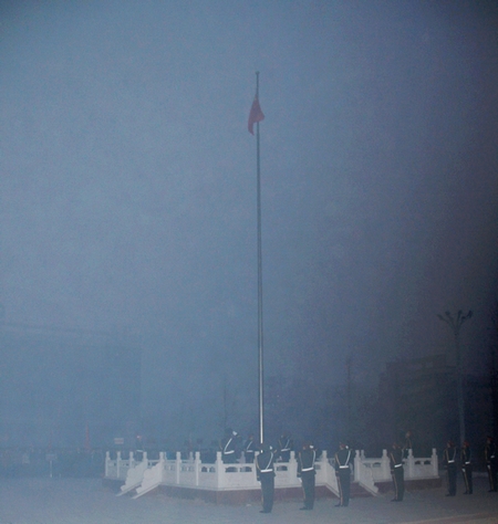 虽然天公不作美,但参加升国旗仪式的1600多名师生代表6点30分就已经在风雪中面向国旗列队集合完毕,等候升旗仪式的