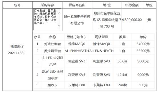 货物详情包括:灯光系统、显示系统、舞台机械及幕布系统、控制系统等设备一批。详见第七章。