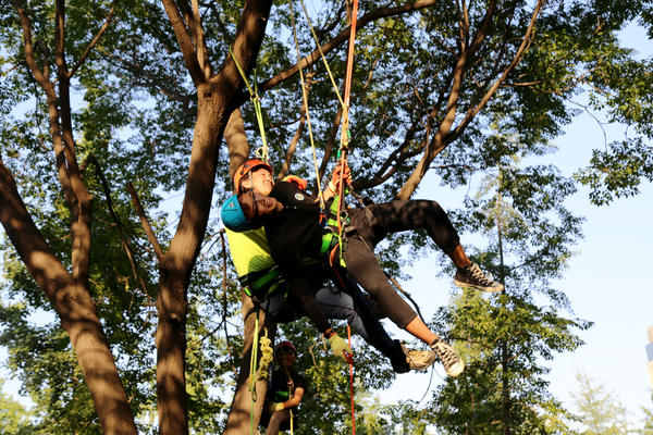 一说起攀树,很多人都会联想到小时候爬树摘果子、掏鸟窝等往事。其实,攀树与爬树完全是两码事,爬树只能依靠上下肢力量拉拽踩踏树干,不仅累而且没有安全措施,如果遇到较高的笔直树干就只能望而兴叹了。任课老师李学良说,攀树是一项借助专业装备完成上升、下降、走枝、飞枝等动作的户外运动项目,除了能体验与平地不同的视觉感受,观察多样的自然生态外,还能修缮树木帮助树木成长。