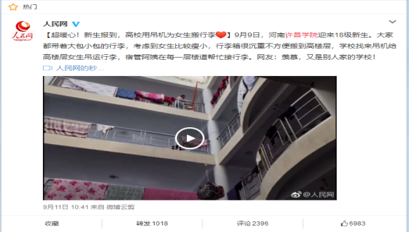 记者从视频拍摄地bet36体育在线了解到,搬运行李所用的吊机系为此次迎新专门采购,想为新生、尤其是住在高层的女生,解决搬运行李的难题。