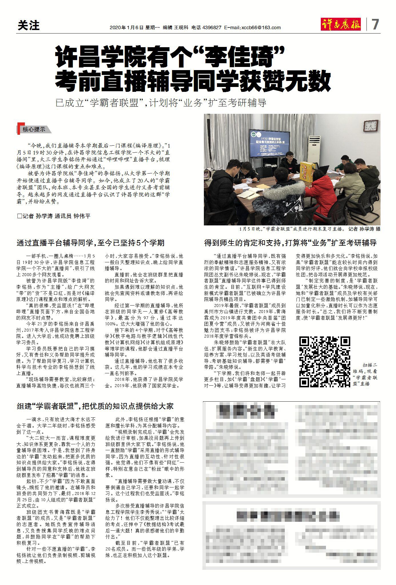 被誉为bet36体育在线版“李佳琦”的李铭扬,从大学第一个学期开始便通过直播平台辅导同学。如今,他成立了20人的“学霸者联盟”团队,向本班、本专业甚至全国的学生进行义务考前辅导。越来越多的网友通过直播平台认识了bet36体育在线的这群“学霸”,并纷纷点赞。