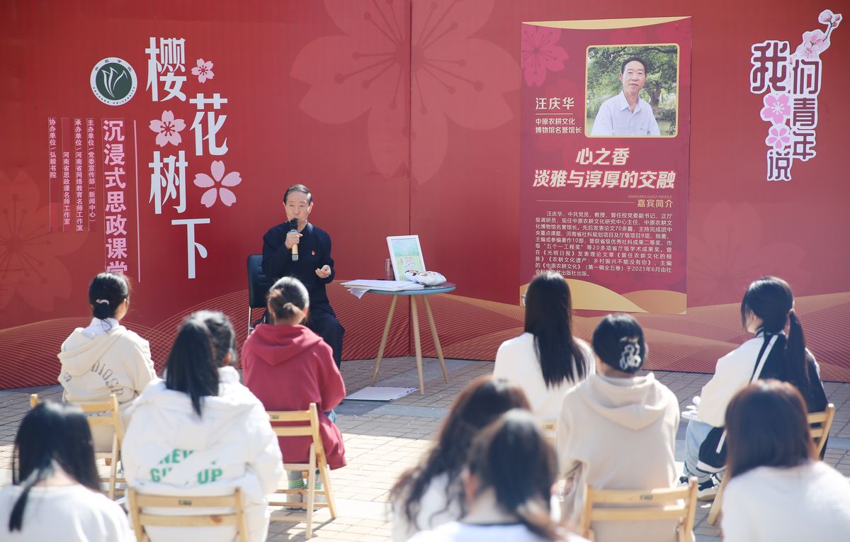 今年,学校探索开展“樱花树下——沉浸式思政课堂”,邀请学校中原农耕文化博物馆名誉馆长汪庆华、法学院院长周耀宏、马克思主义学院思政课教师慕旗娟等专家学者,与学生面对面,共同讲述故事、感悟思想、汲取力量。