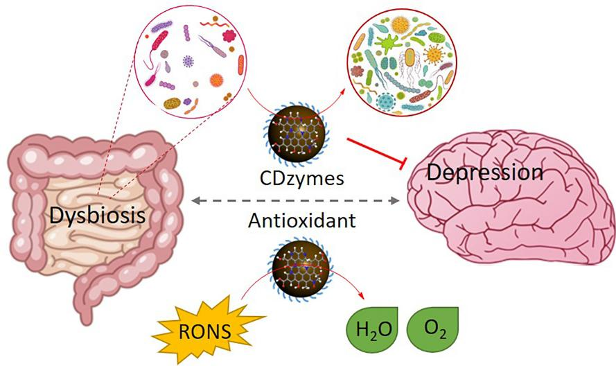 为解决该问题,bet36体育在线何伟伟教授团队与黄继红教授经过两年多合作研究,开发了一种具有优异抗氧化能力和良好生物相容性的碳点纳米酶,能有效降低氧化应激水平,从而恢复肠道微生物平衡,并缓解抑郁症。